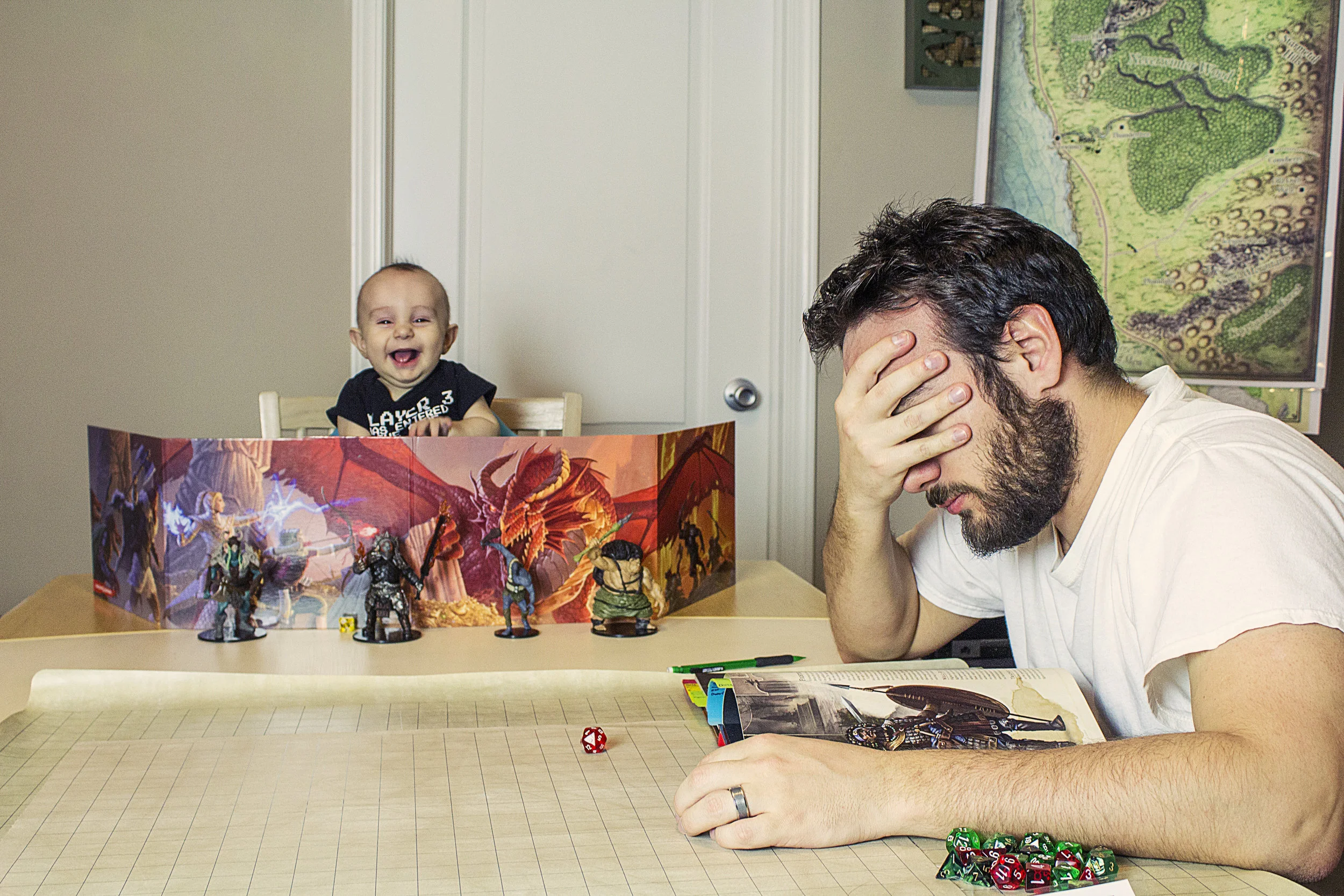 This death scene ended up inspiring me to write a campaign that told of lost friends, a tyrannical wizard, and a few solid encounters with said wizard. As with everything, I started dumping way too much time into this. I started writing and writing, and started spending less and less time with my family. My wife encouraged me to write, but also started expressing concerns. So I attempted to balance the two by doing both at the same time. I strapped my mini-Dungeon Master up in his björn on my chest, and we started writing standing at the kitchen counter, or I would prepare for the coming session with him strapped to me as I was hastily drawing maps and scribbling notes before a session. It just was not working though, having your cake and eating it too is quite hard, but there is an answer, moderation. Moderation, my good friend, seems to do the trick. It is something that I am still practicing with, but I am slowly getting better.