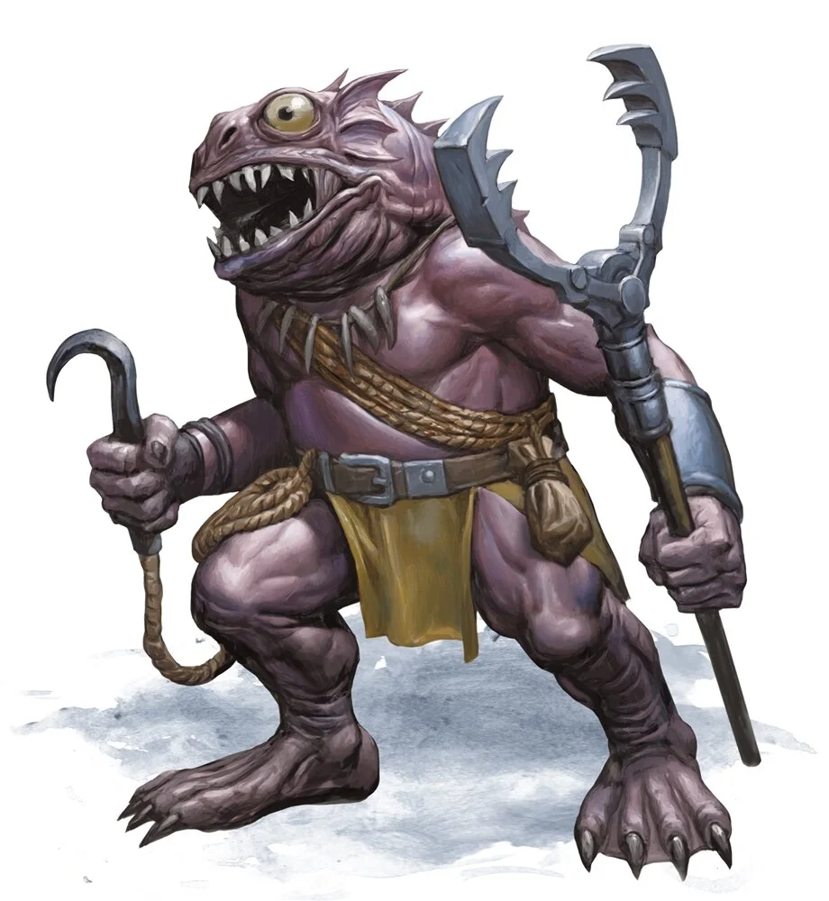 Now these guys are like little Kuo-toa Clerics. Kuo-toa are these little bipedal fish people that have in some lores been enslaved by the Drow and in more recent lore has been enslaved and broken by the Illithids. They are scavengers of sorts, and the y want to capture not kill. You can tell from their pincer staff that they are more inclined to capture. But why?